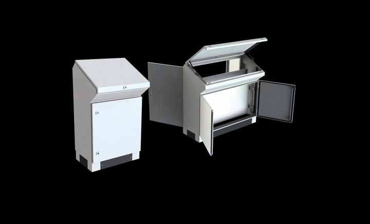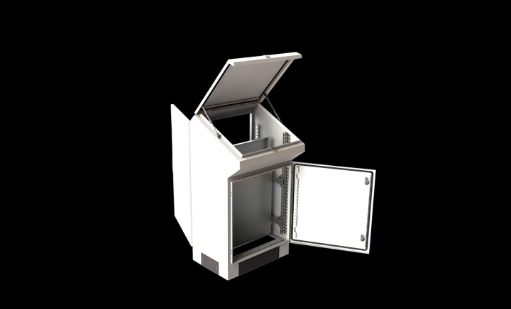 Enclosure, front door, rear door, gas-spring assisted top door, H 100 mm plinth, gland plates, and 2 pcs mounting plates