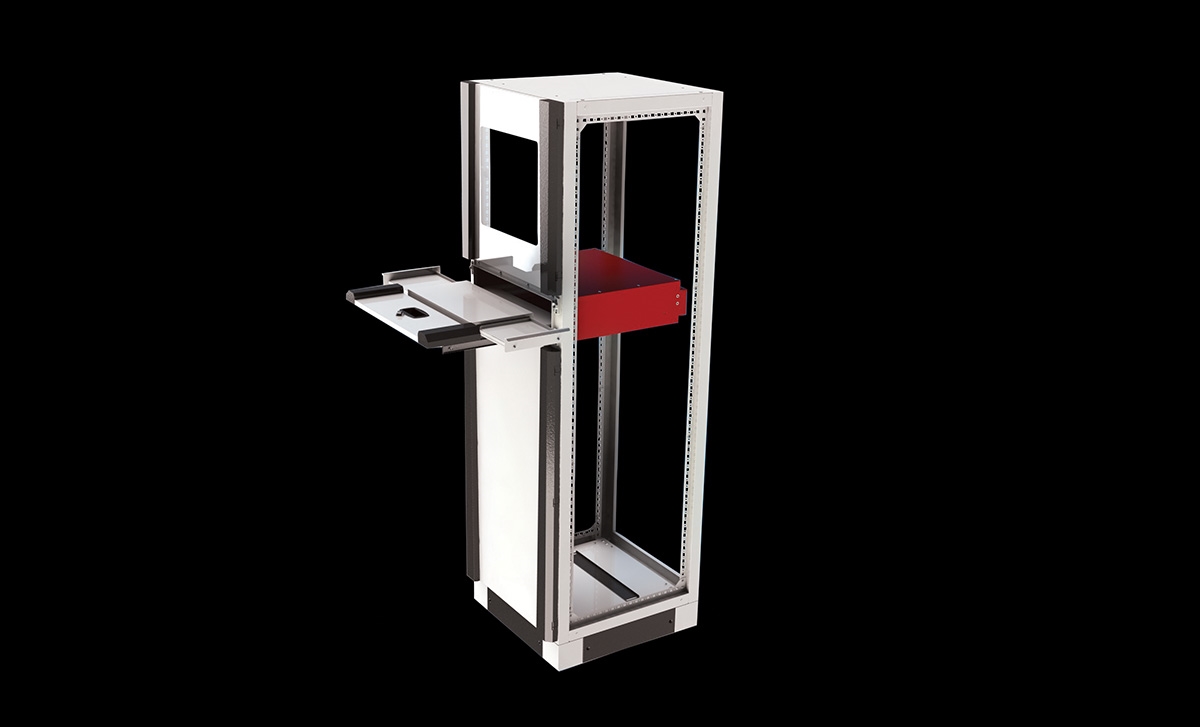 Enclosure frame, keyboard drawer, 2 pcs shelves, front bottom door, Front top glazed door, rear door , 2 pcs side panels, top panel, H100mm plinth and gland plates